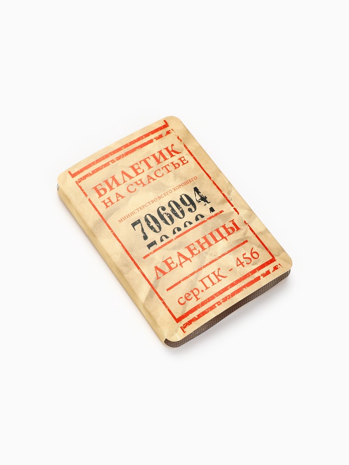 Упаковка жевательной резинки с шуточной надписью "Счастливый билет" – отличный сюрприз для близкого человека или коллеги. Жвачка в форме маленьких разноцветных шариков упакована в блистер, имеет приятный сладкий вкус апельсина. А шутливое упаковка в виде билета поможет поднять настроение в любой ситуации.