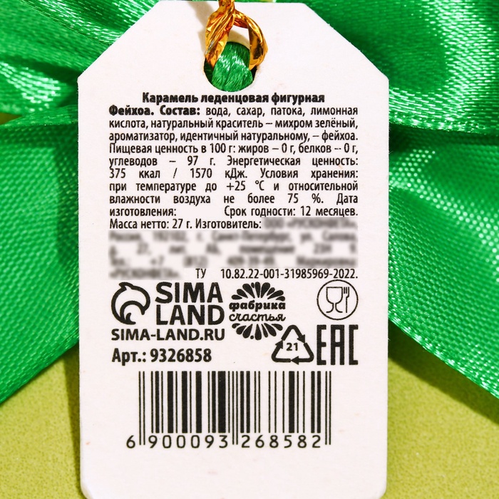 Состав: вода, сахар, патока, лимонная кислота, натуральный краситель – михром зелёный, ароматизатор, идентичный натуральному, – фейхоа.