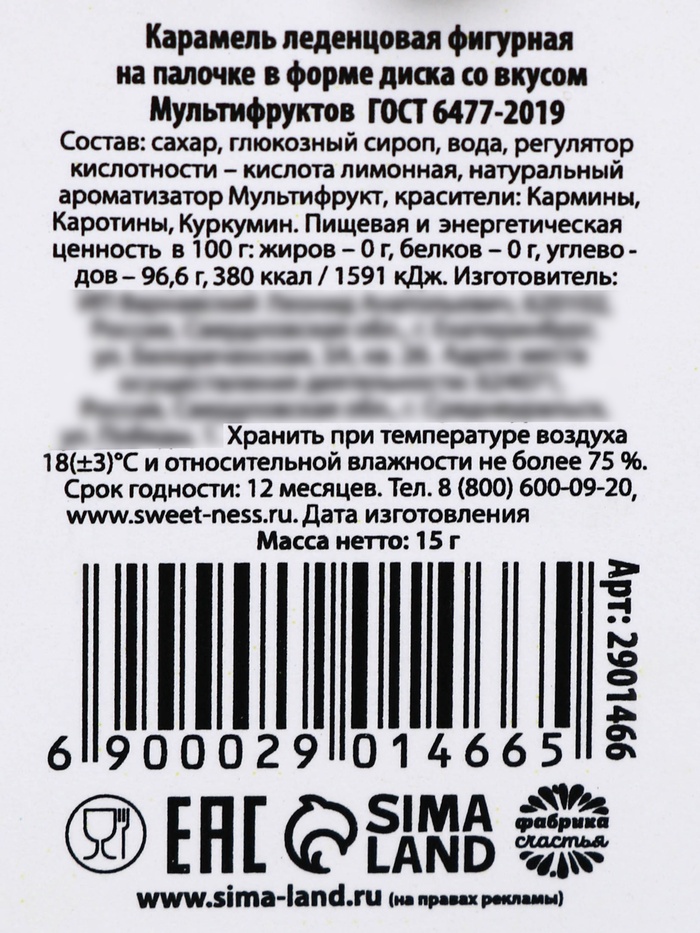 Состав: сахар, патока, вода, регулятор кислотности – лимонная кислота, натуральный ароматизатор «Мультифрукт», натуральные красители: кармин, Б-апокаротиновый альдегид, куркумин.