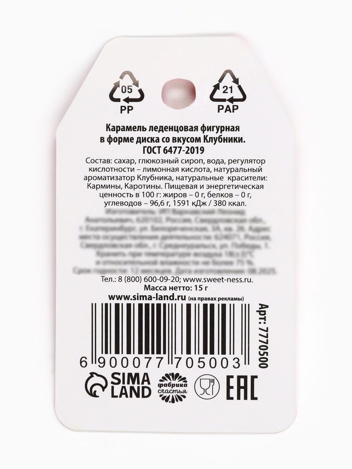 Состав: сахар, глюкозный сироп, вода, регулятор кислотности - лимонная кислота, натуральный ароматизатор: Клубника, красители: Кармины, Каротина, бета-апо-8-Каротиновый альдегид.