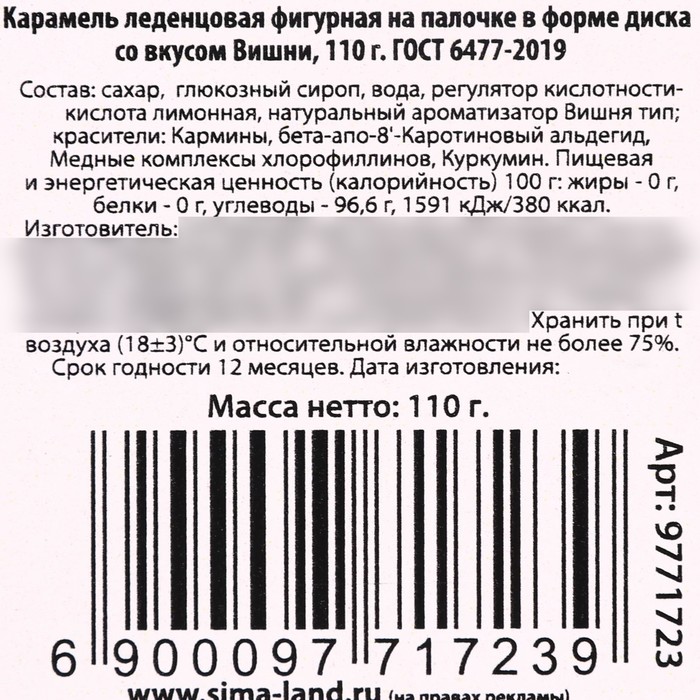 Состав: сахар, глюкозный сироп, вода, регулятор кислотности - кислота лимонная, натуральный ароматизатор вишня тип; красители: Кармины, бета-апо-8-Каротиновый альдегид, Медные комплексы хлорофиллинов, Куркумин.