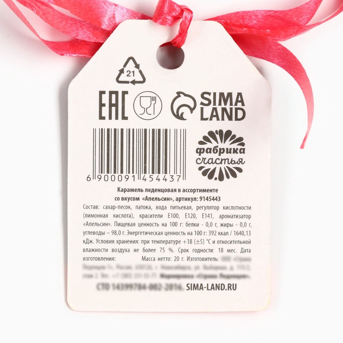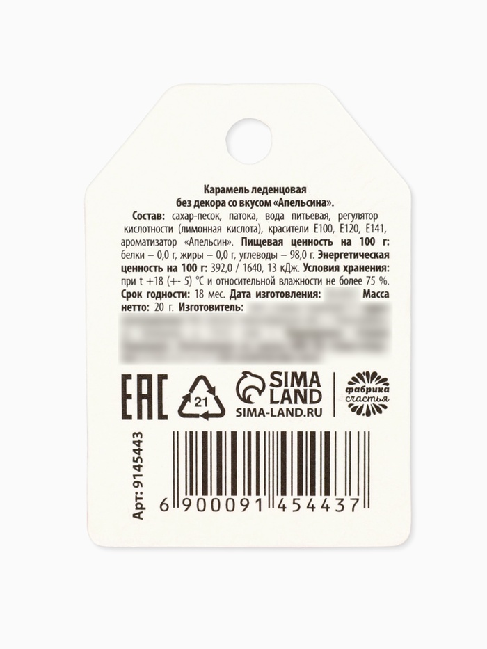 Состав: сахар - песок, патока, вода питьевая, регулятор кислотности (лимонная кислота), красители Е100, Е120, Е141, ароматизатор "Апельсин".