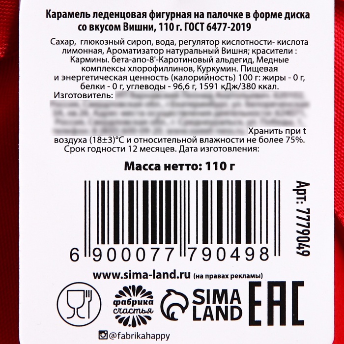 Состав: сахар, глюкозный сироп, вода, регулятор кислотности - лимонная кислота, натуральный ароматизатор Вишня, красители: Кармины, бета-апо-8'-Каротиновый альдегид, Медные комплексы хлорофиллов, Куркумин.