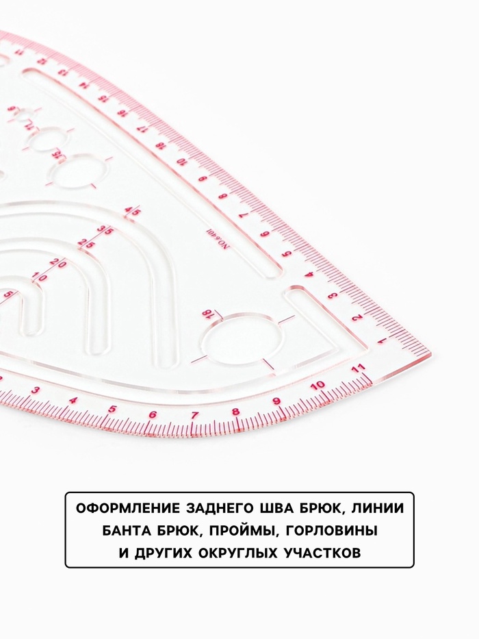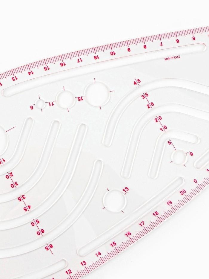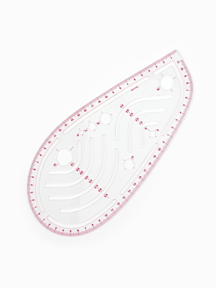 Лекало «Капля» идеально подойдёт для конструирования брюк, построения углов на воротнике, разметке припусков и петель. Круглая сторона станет отличным помощником для построения линий горловины, проймы, карманов, окружности под разметку пуговиц разного размера.