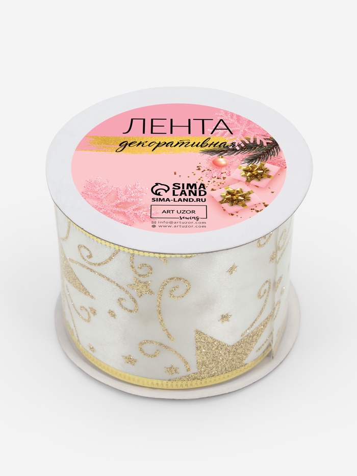 Атласная лента с золотыми звёздами наполняет пространство тёплым праздничным сиянием. Золотистый узор на белом атласе создаёт эффект ручной вышивки, добавляя декору стоимость и торжественность. Девяти метров достаточно для оформления большой ели, драпировки мебели и создания роскошных подарочных бантов.