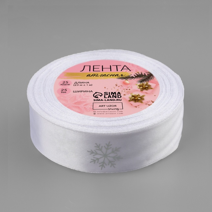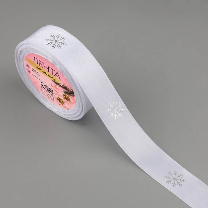 Лента атласная с тиснением «Снежинки», 25 мм, 23 ± 1 м, цвет белый/серебряный №001