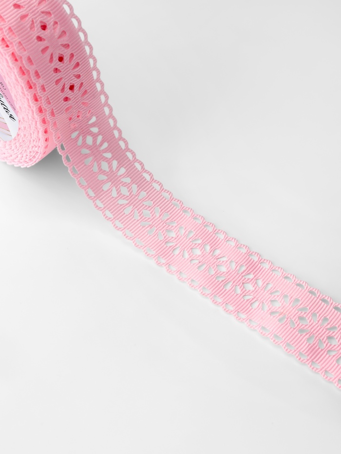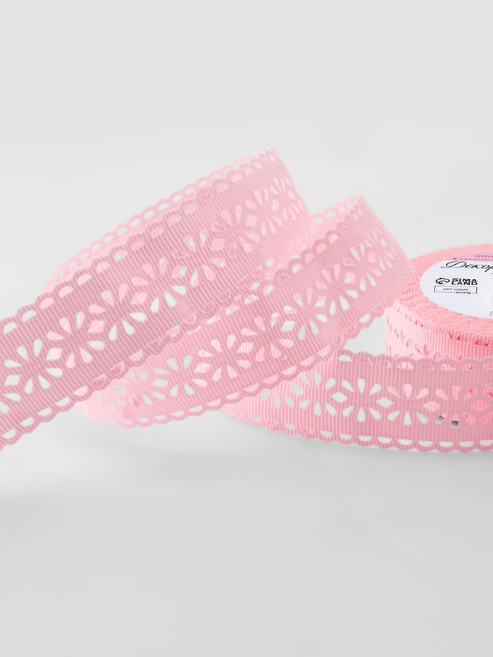 Розовая ажурная лента с репсовой основой сочетает структурность и воздушность. Её перфорированный узор создаёт лёгкий, почти кружевной эффект, подходя для проектов, где важна нежность и текстура. Длина более 9 метров позволяет экспериментировать с объёмным декором.