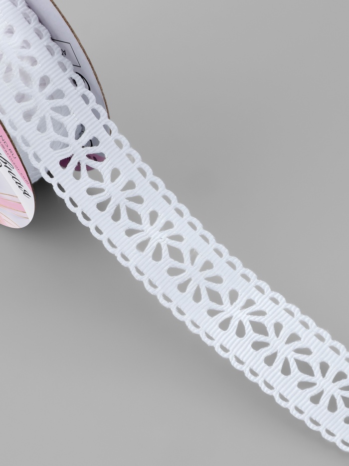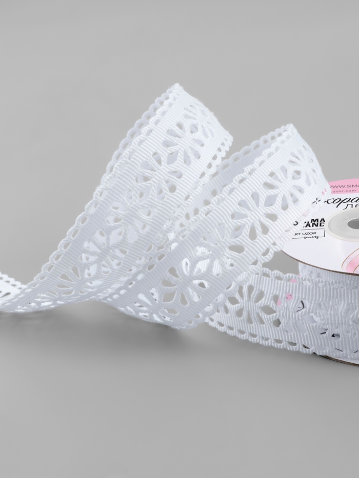 Белая ажурная лента с цветочным узором сочетает классическую чистоту цвета с изящным рельефным рисунком. Её филигранный орнамент создаёт эффект тонкого кружева, подходя для проектов, где важны нежность и романтичность. Длина более 9 метров позволяет свободно экспериментировать с объёмным декором.