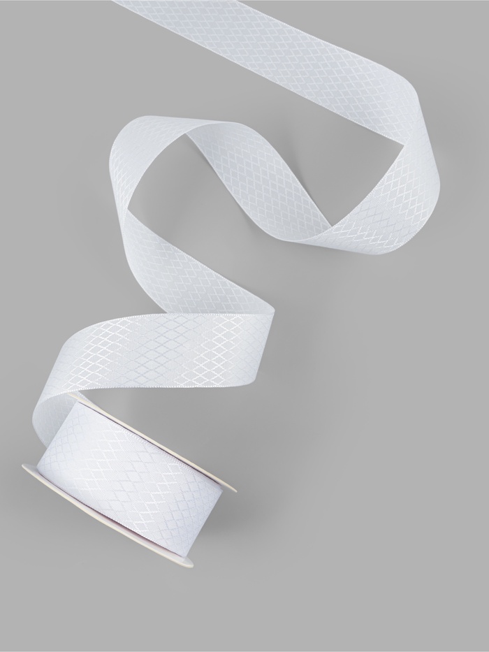 Белая декоративная лента с геометрическим рисунком в форме ромбов подойдёт для оформления подарков, аксессуаров и предметов интерьера. Чёткий орнамент создаёт структурный ритм в композиции и подчёркивает аккуратность ручной работы. Лента востребована в скрапбукинге, оформлении текстиля и создании уникального декора для праздничных событий.