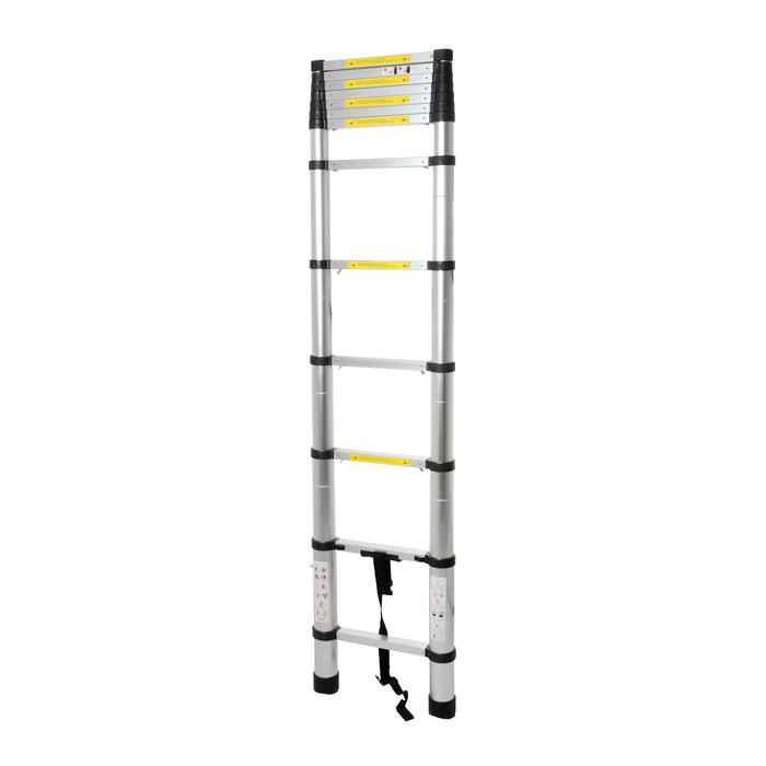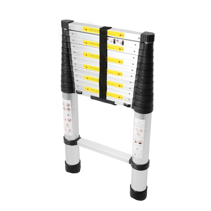 Лестница достаточно лёгкая, ведь изготовлена из алюминия. А для удобного хранения в комплекте идёт ремешок на липучке для фиксации.