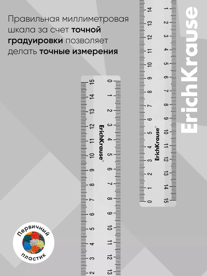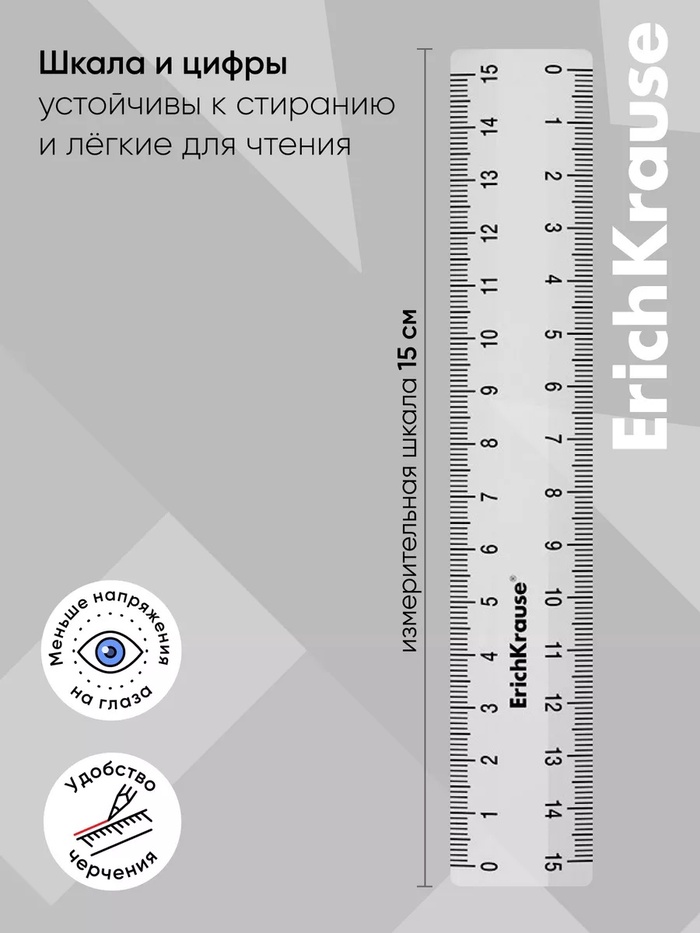 Прозрачная линейка из высококачественного пластика. Четкая печать двухсторонней шкалы. Длина разметки – 15см.