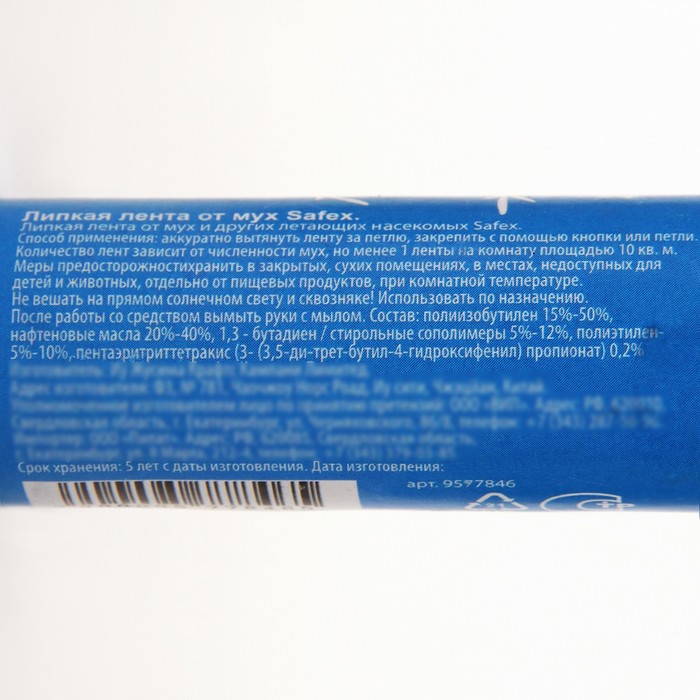 Способ применения: аккуратно вытянуть ленту за петлю, закрепить с помощью кнопки или петли. Количество лент зависит от численности мух, но не более 1 ленты на комнату площадью 10 кв.м.