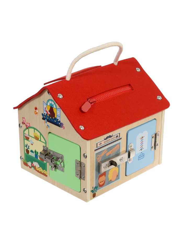 Деревянный бизидомик «Играем и развиваемся» — это компактный тренажёр для ума и пальчиков, созданный для детей от 3 лет. В форме уютного домика он объединяет знакомые механизмы повседневной жизни: щеколду, задвижку, молнию — всё то, что малыш с удовольствием крутит, открывает и исследует в реальном мире, но теперь в безопасном, игровом формате.