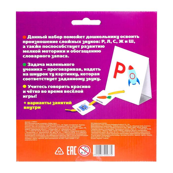 Логопедическая шнуровка «Найди звук» — игра, которая поможет дошкольнику освоить произношение сложных звуков: Р, Л, С, Ж и Ш. Игра способствует развитию у ребёнка мелкой моторики и пополнению словарного запаса.
