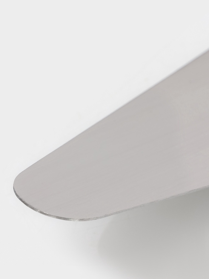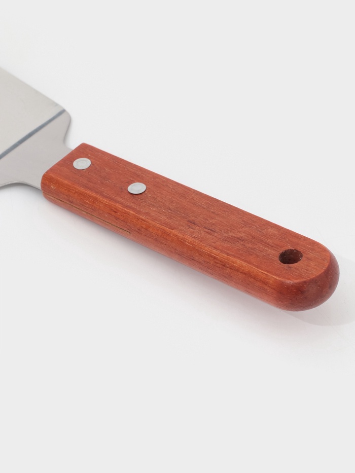 Лопатка выполнена из высококачественной нержавеющей стали, что гарантирует долговечность и устойчивость к коррозии. Эргономичная ручка из дерева обеспечивает удобный захват и добавляет изделию изысканности. Без покрытия и рисунков, эта лопатка акцентирует внимание на своей функциональности и простоте.