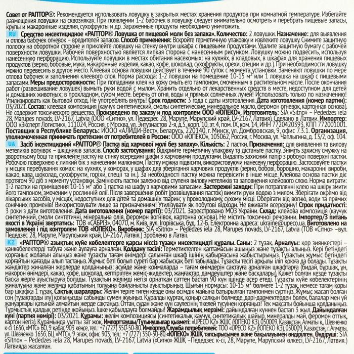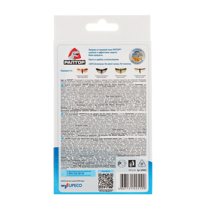 Специальная ловушка для мух представляет собой картонную гильзу, внутри которой свернутая в спираль длинная лента со специальным клеящим составом высокого качества. Пролетающие мимо насекомые задевают ленту и прилипают к ней, не имея ни единого шанса освободиться.Липкая лента для ловли мух Раптор длиной 85 см справляется со своей задачей в течение 2 месяцев, однако в случае заполнения насекомыми, должна заменяться раньше.Функцию действующего вещества в данном случае выполняет высококачественный клеевой состав, который надежно удерживает мух на поверхности ленты. Клей не содержит отравляющих или токсических компонентов, безопасен для человека и окружающей среды. Поэтому ленту против мух можно использовать даже аллергикам.Инструкция: Возьмите одной рукой картонную гильзу, а другой потяните за петлю, совершая вращательные движения. Вытащите ленту до конца, но не отрывайте ее от гильзы. Закрепите ленту на потолке. Используйте ленту в течение 2 месяцев, после чего замените ее новой.