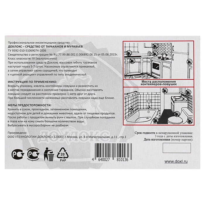 ОписаниеКомплект, состоящий из 4 ловушек и пакета с гелем (40 мл), содержит самую правильную пропорцию геля и ловушек для обработки помещений с не высокой и средней степенью зараженности тараканами. Примерный расход средства в условиях обычной квартиры: Если тараканов мало, они появились недавно 1 упаковки хватит на 40 кв. метров. Если тараканов мало, они появились давно 1 упаковки хватит на 10 кв. метров. Если тараканов много, они появились недавно 1 упаковки хватит на 6 кв. метра. Если тараканов много, они появились давно 1 упаковки хватит на 4 кв. метра.Составдиазинон 0,5% технические компоненты 99,5%Инструкция по применению: размять упаковку, затем вскрыть её ножницами согласно инструкции. Аккуратно нанести гель полосками по периметру помещения: вдоль стен и плинтусов, а также щелей. Особое внимание необходимо уделить вентиляционным отверстиям. Ловушки расставляются в местах скопления тараканов на расстоянии около 1 м друг от друга.