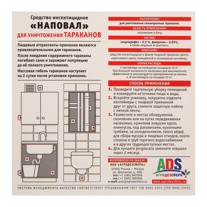 После поедания содержимого тараканы погибают сами и заражают популяцию до ее полного уничтожения. Массовая гибель тараканов наступает на 2 сутки после установки приманок. 2 контейнера на помещение площадью до 10 кв. м. При большой численности насекомых для максимальной эффективности рекомендуется одновременная установка 4-8 контейнеров на площади 10 кв. м.