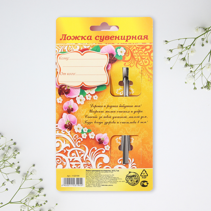 Ложка с лазерной гравировкой и изящной рукояткой преподносится на красочной открытке. На оборотной стороне изделия специально отведено место для подписи: кому и от кого был вручён подарок.