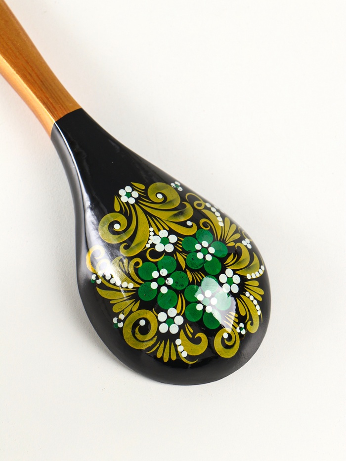 Изготовленная из берёзы, она не просто удобно лежит в руке, но и становится маленьким произведением искусства на вашем столе. Ручная хохломская роспись с её алыми узорами на чёрном фоне превращает обычный столовый прибор в выразительный акцент сервировки.