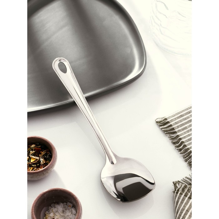Гарнирная ложка станет незаменимым помощником как во время повседневной готовки, так и при создании кулинарных шедевров для торжественных событий. Изделие подойдёт для помешивания и снятия пробы с готовящихся блюд, а также для раздачи уже готового угощения.
