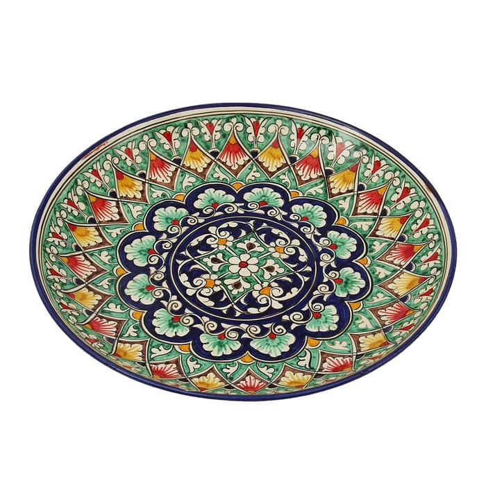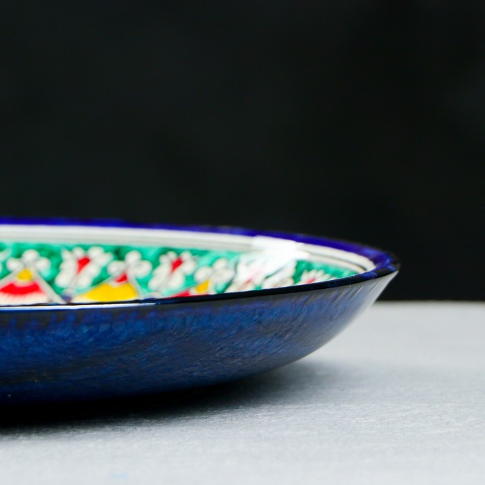 Это узбекская глубокая керамическая тарелка диаметром 28 см, украшенная ручной росписью с растительным орнаментом в синем цвете. Ее гладкая матовая поверхность и традиционный дизайн делают ее не только функциональной посудой, но и элементом национального стиля. Такая тарелка отлично подойдет для сервировки супов, салатов или горячих блюд, добавляя уют и этническую атмосферу на ваш стол.