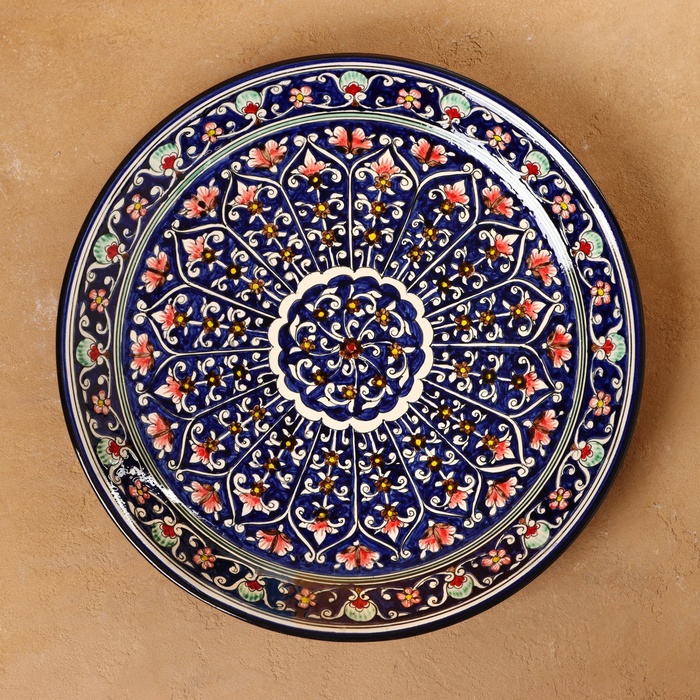 Керамическая тарелка с растительным орнаментом — это воплощение узбекской традиционной эстетики и мастерства. Изделие диаметром 36 см выполнено вручную, что делает каждый экземпляр уникальным. Синий цвет в сочетании с растительным узором придаёт посуде национальный колорит и делает её гармоничным элементом интерьера или сервировки.