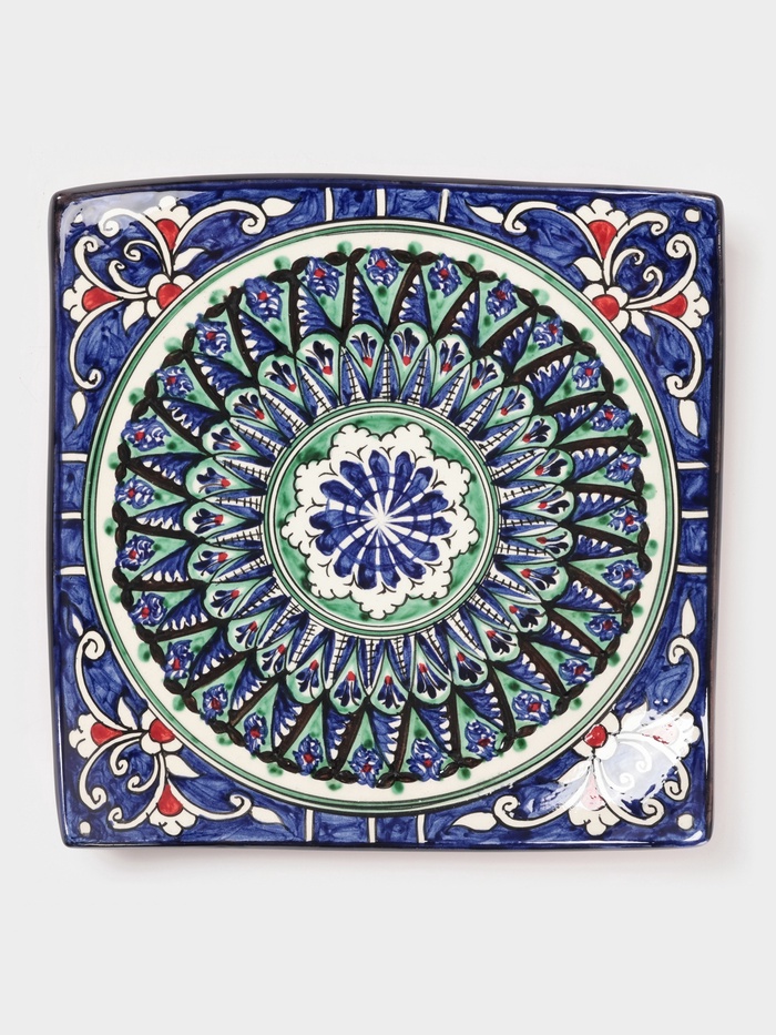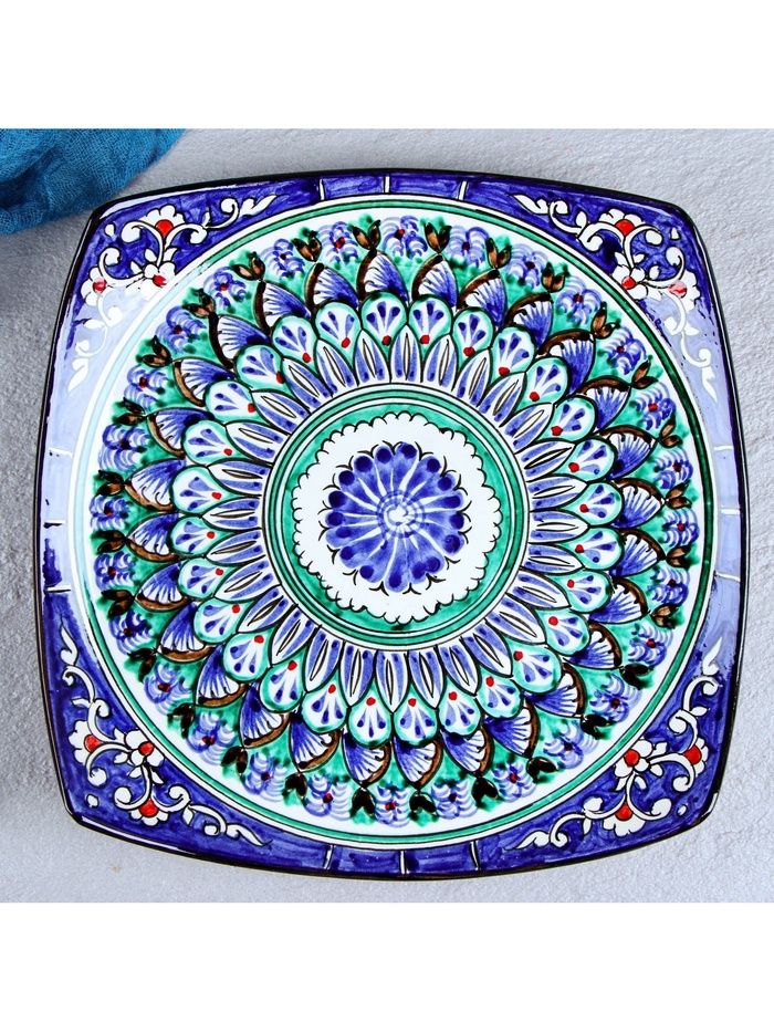 Керамическая тарелка «Узоры» — это воплощение узбекского искусства в форме повседневной посуды. Синий растительный орнамент и квадратная форма придают изделию строгость и художественную выразительность. Каждая линия рисунка выполнена вручную, подчёркивая связь с народными традициями и мастерством риштанских гончаров.