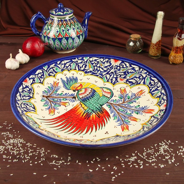 Ляган «Жар-птица» от Риштанской керамики, 41 см: великолепие ручной работы, оживающее на вашем столе. Яркие краски, цветочные узоры и образ мифической птицы создадут атмосферу праздника и удивления.