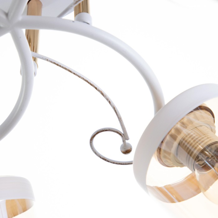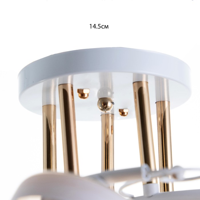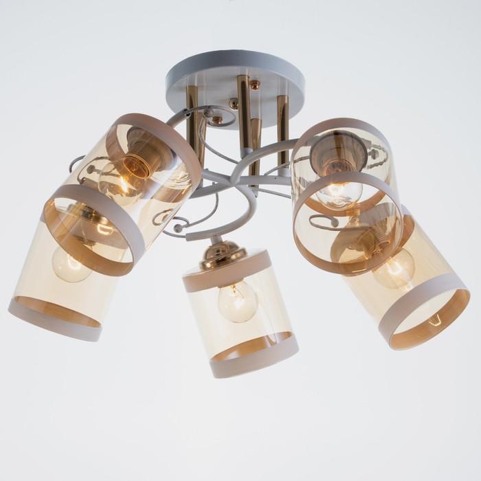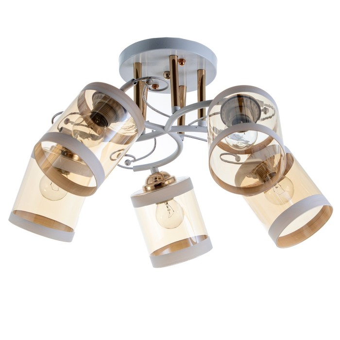Свет, который держит баланс между тёплым и чистым. Потолочная люстра 5-ламповая в белом и золоте с цилиндрическими плафонами – лаконичное решение для гостиной, спальни или кухни до 10 м². Бело-золотое основание из металла и пять стеклянных рассеивателей с медовым оттенком создают мягкий, уютный свет без ощущения тяжести.