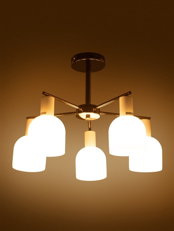 Модель рассчитана на пять ламп с цоколем E14 и максимальной мощностью до 40 Вт, что позволяет подобрать оптимальные источники света — классические лампы накаливания, светодиодные или энергосберегающие, в зависимости от желаемого уровня яркости и стиля освещения. Благодаря потолочному креплению на планку монтаж происходит быстро и надёжно, а управление через настенный выключатель остаётся простым и привычным.