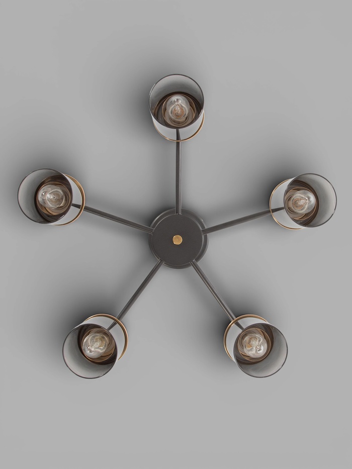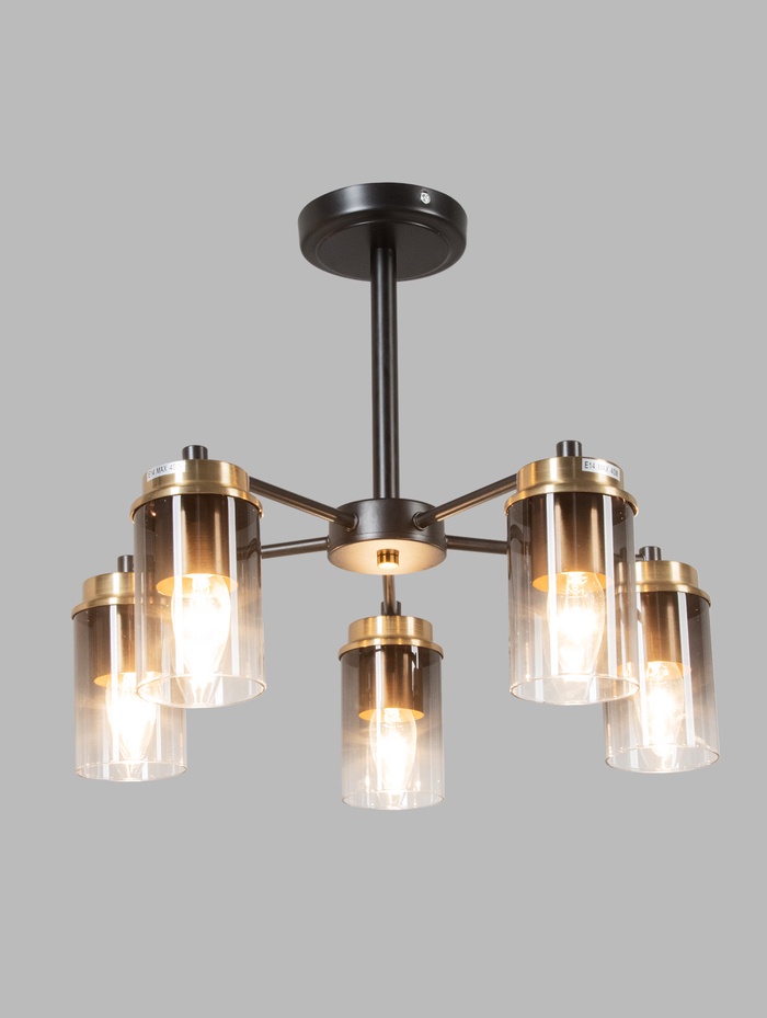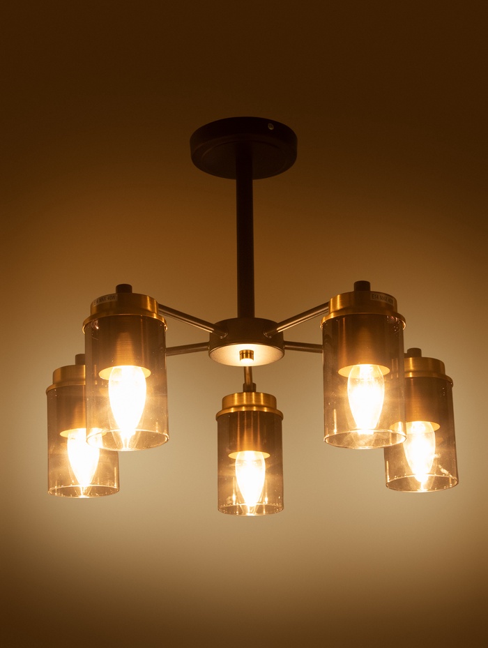 Люстра рассчитана на пять ламп с цоколем E14 и мощностью до 40 Вт каждая, что даёт возможность подобрать оптимальные источники света — от тёплых ламп накаливания до энергоэффективных светодиодных. Потолочный монтаж без подвеса делает светильник удобным для комнат с невысокими потолками.