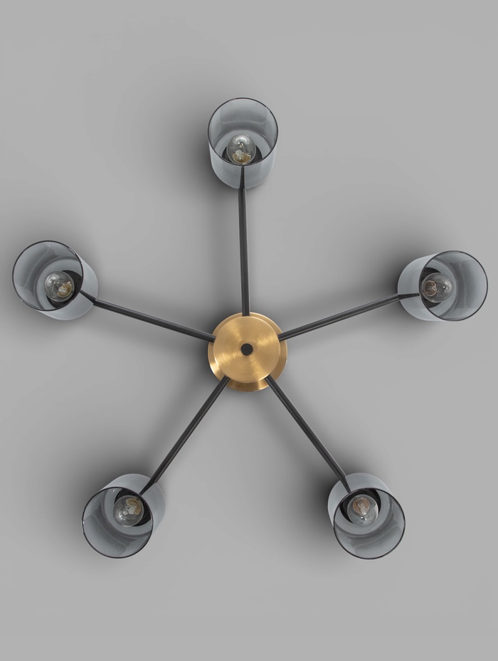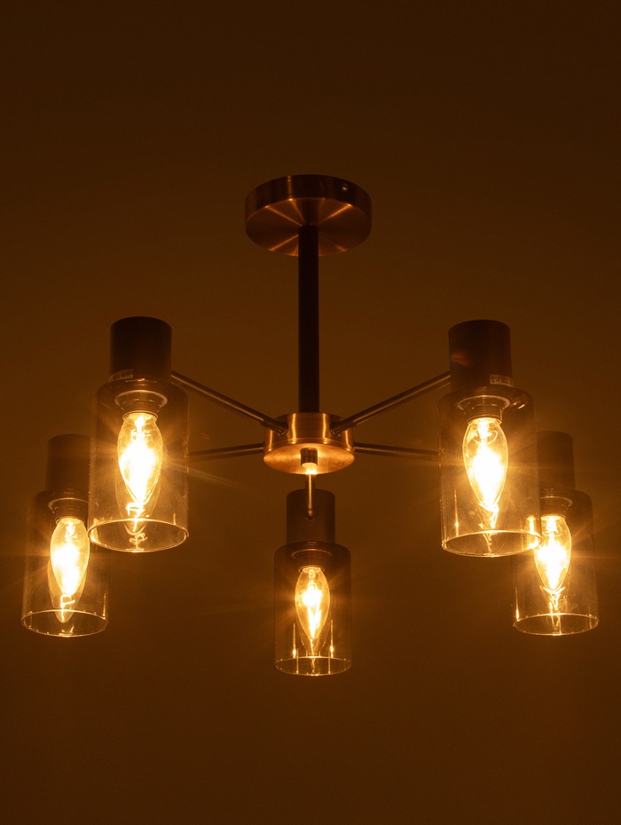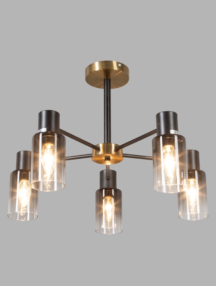 Потолочная люстра с медно-чёрным металлическим основанием и пятью прозрачными стеклянными плафонами — это гармоничное сочетание выразительного дизайна и продуманной функциональности. Такой светильник одинаково уместен в гостиной, столовой или на кухне, где важно создать яркое, но не режущее глаза освещение. Медь придаёт интерьеру тёплую визуальную ноту, а чёрные детали добавляют глубину и современный характер, делая люстру стильным акцентом всего пространства.