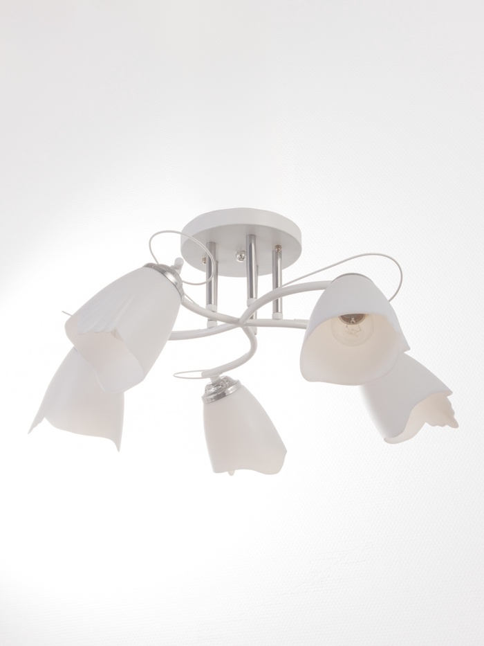 Свет, собранный в лёгкий цветок. Потолочная люстра с пятью белыми плафонами — современное решение для гостиной или спальни до 20 м². Компактная (50×25 см), но мощная по световому охвату, она сочетает белые конусные плафоны и хромированную арматуру, создавая чистый, невесомый образ. Лампы не входят в комплект — подойдут энергосберегающие или филаментные с цоколем E27 до 15 Вт.