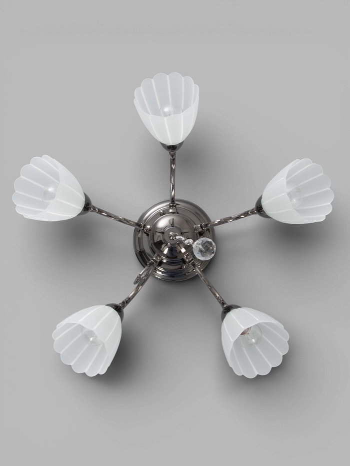 Люстра рассчитана на пять источников света с универсальным цоколем E27, что даёт вам свободу выбора ламп (накаливания, светодиодных или энергосберегающих) в зависимости от желаемого уровня яркости и энергоэффективности. Управление осуществляется привычным настенным выключателем, что упрощает эксплуатацию без дополнительных устройств управления. Высокое качество металла и стекла обеспечивает долговечность и эстетичный внешний вид на годы вперёд.