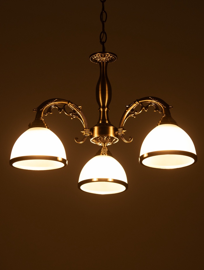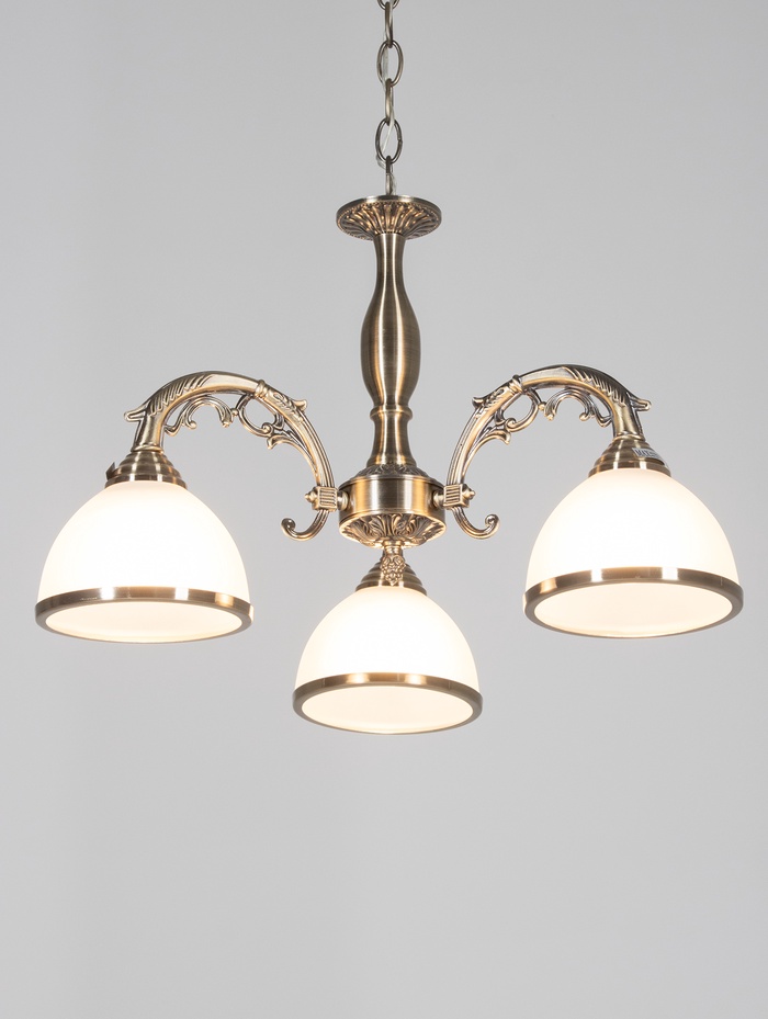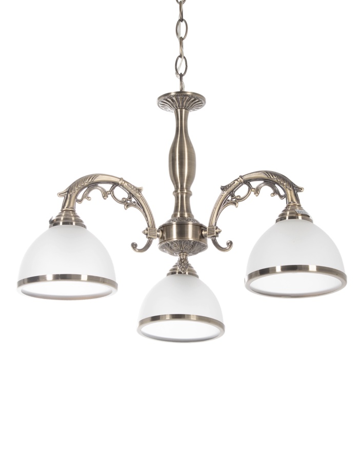 Потолочная люстра с тремя источниками света и благородной бронзовой отделкой объединяет в себе стиль классики и продуманную функциональность, создавая уютную атмосферу в жилых помещениях. Эффектная игра белых стеклянных плафонов и металлического основания подчёркивает интерьер и делает светильник заметным, но элегантным элементом декора. Высота подвеса регулируется в диапазоне от 32 до 70 см, что даёт гибкость при установке в помещениях с разной высотой потолков.