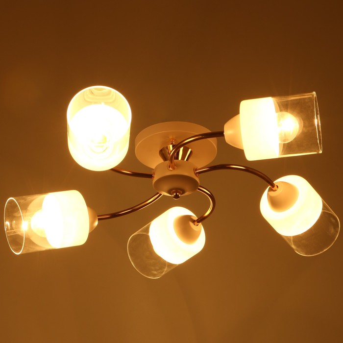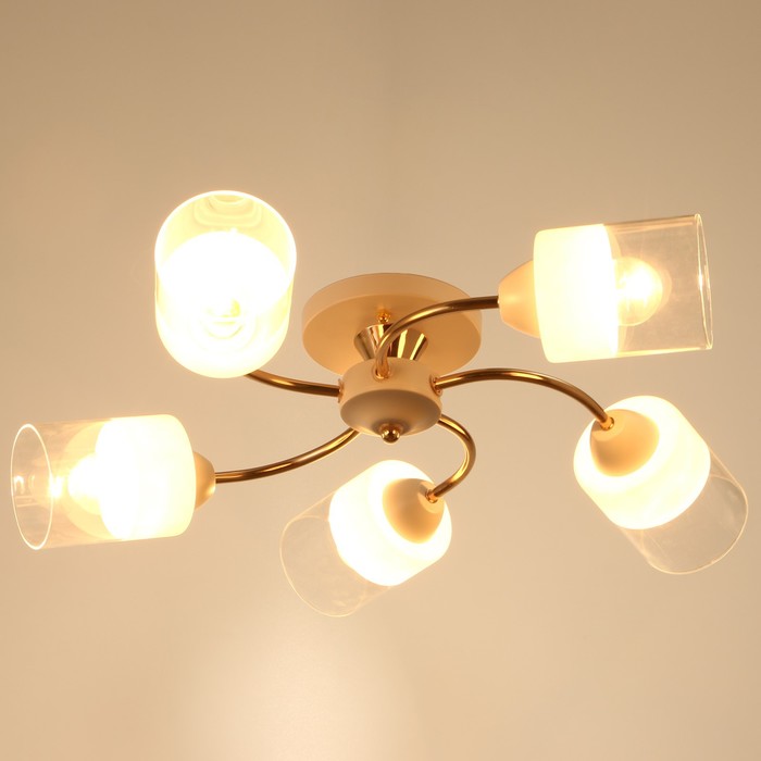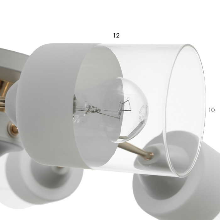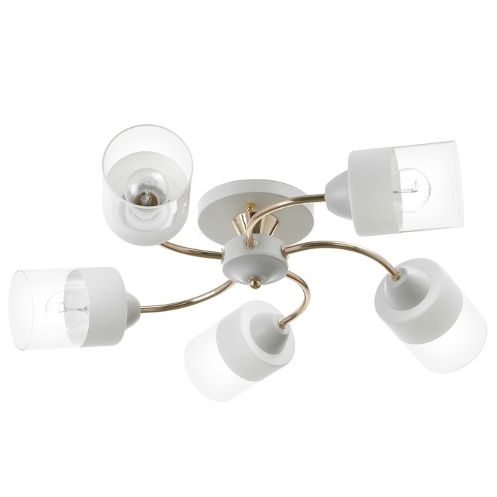 - Равномерное освещение без теней: Пять ламп с цоколем E27 и мощностью до 40 Вт создают плотный световой поток. Цилиндрические стеклянные плафоны направляют свет в стороны — охватывая стены и углы, визуально расширяя помещение.