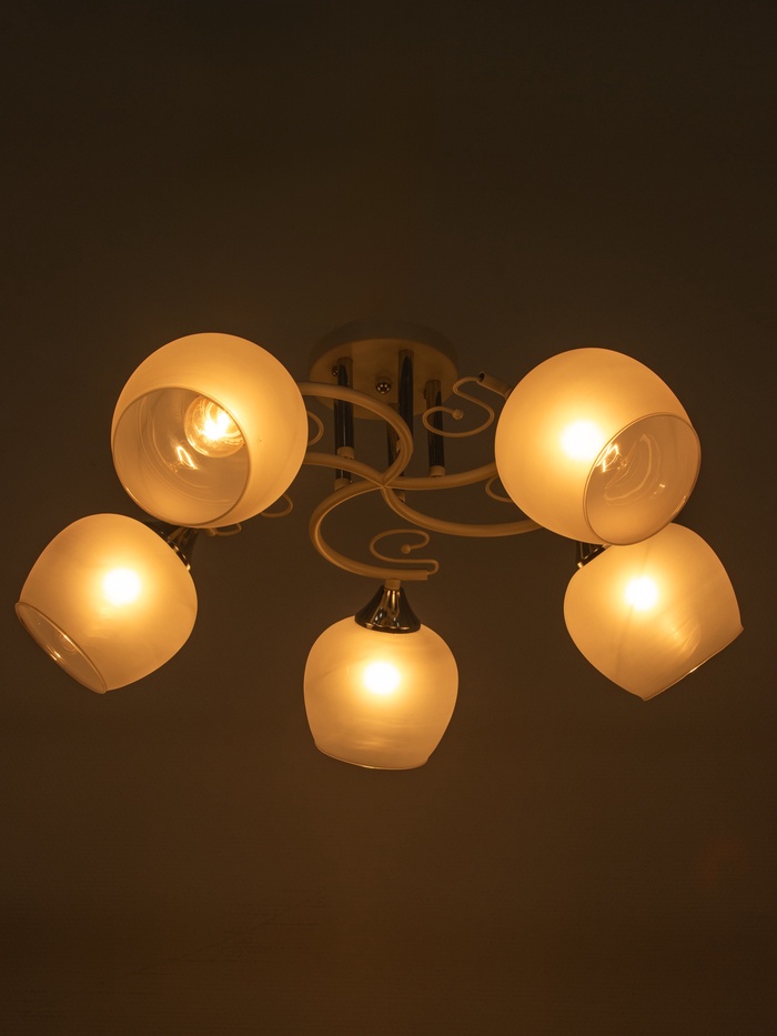 - Достаточно света для большой комнаты: Пять источников дают общий световой поток 1200–1500 лм — этого хватает для основного освещения гостиной или спальни без дополнительных ламп. Пластиковые плафоны мягко рассеивают свет, не искажая его оттенок.