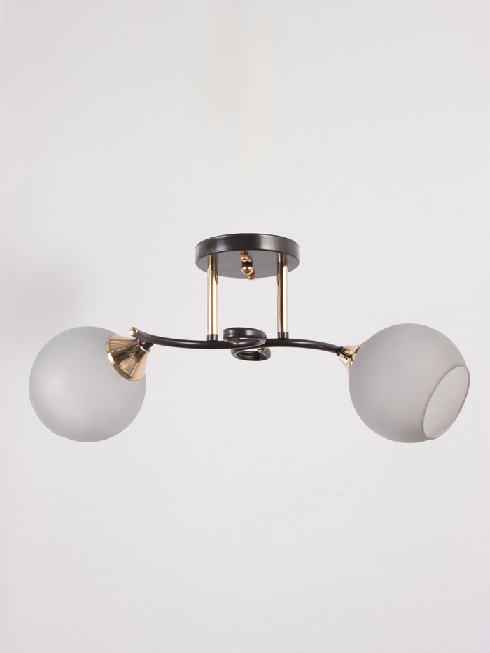 Свет с оттенком роскоши. Потолочная люстра с двумя плафонами в стиле арт-деко — изысканное решение для спальни, гостиной или просторного коридора до 12 м². Кофейно-золотистое металлическое основание создаёт тёплый контраст с белыми полусферическими плафонами, а компактные габариты (45×18×24 см) позволяют разместить её даже в помещениях со средней высотой потолков. Лампы не входят в комплект — подойдут любые с цоколем E27 до 60 Вт: накаливания, филаментные или энергосберегающие.