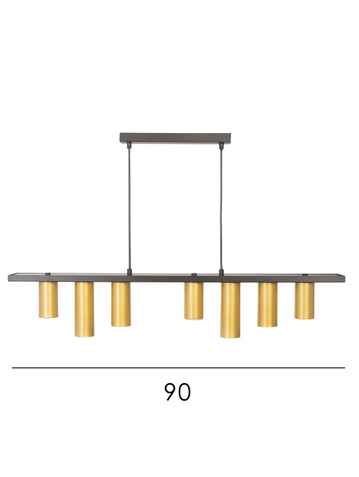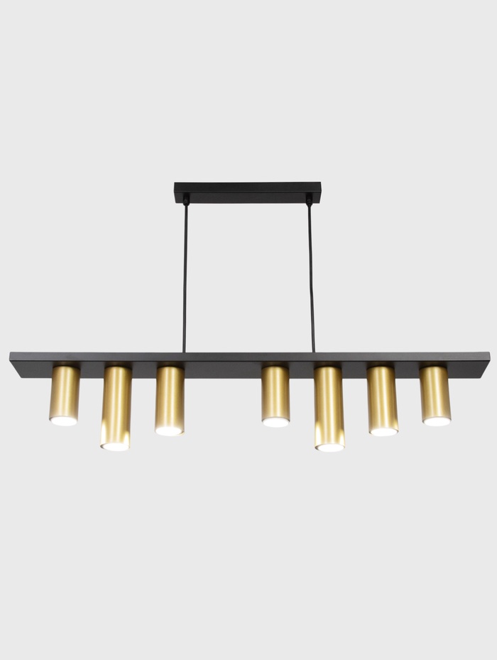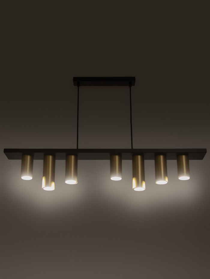 Подвесная люстра с вытянутой композицией и семью цилиндрическими плафонами создаёт выразительное многоуровневое освещение. Свет направляется точечно, позволяя формировать как общее, так и акцентное освещение, подчёркивая геометрию пространства.