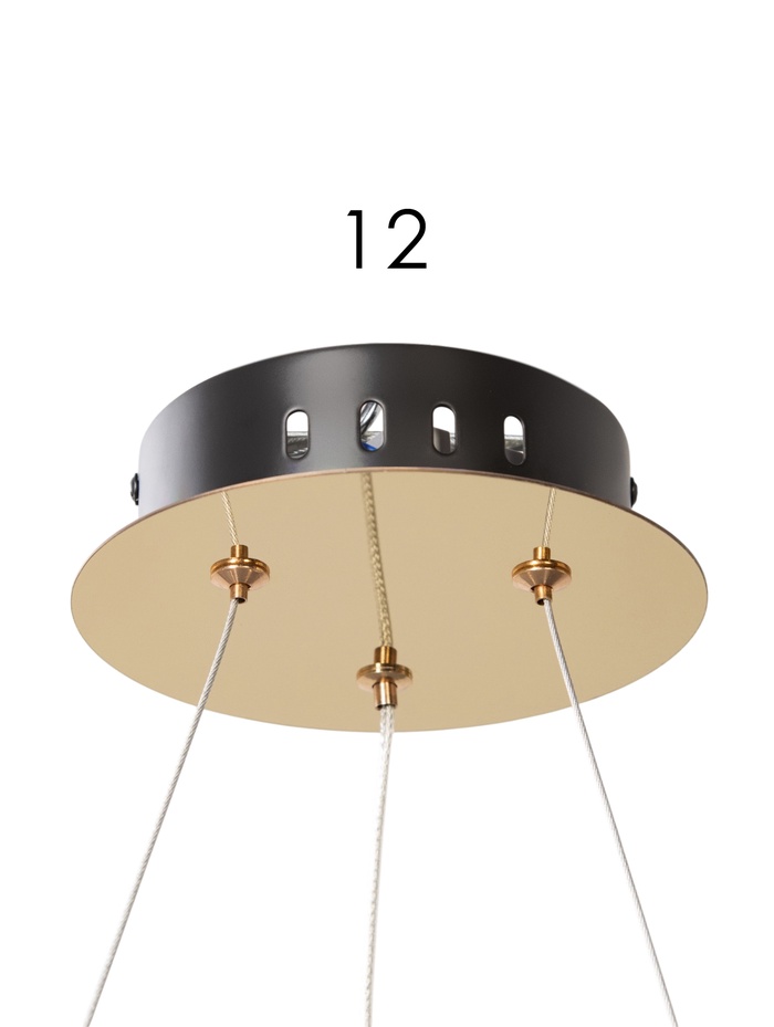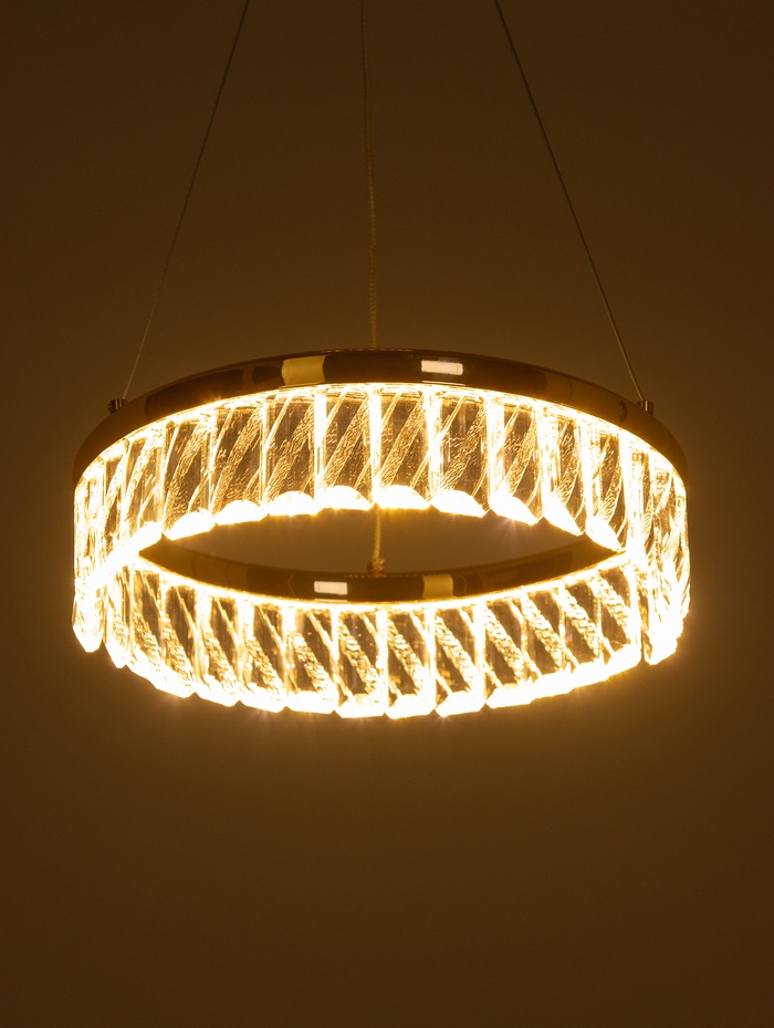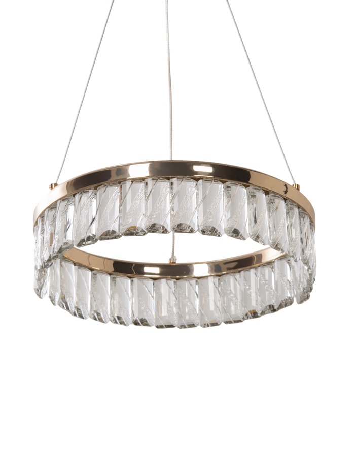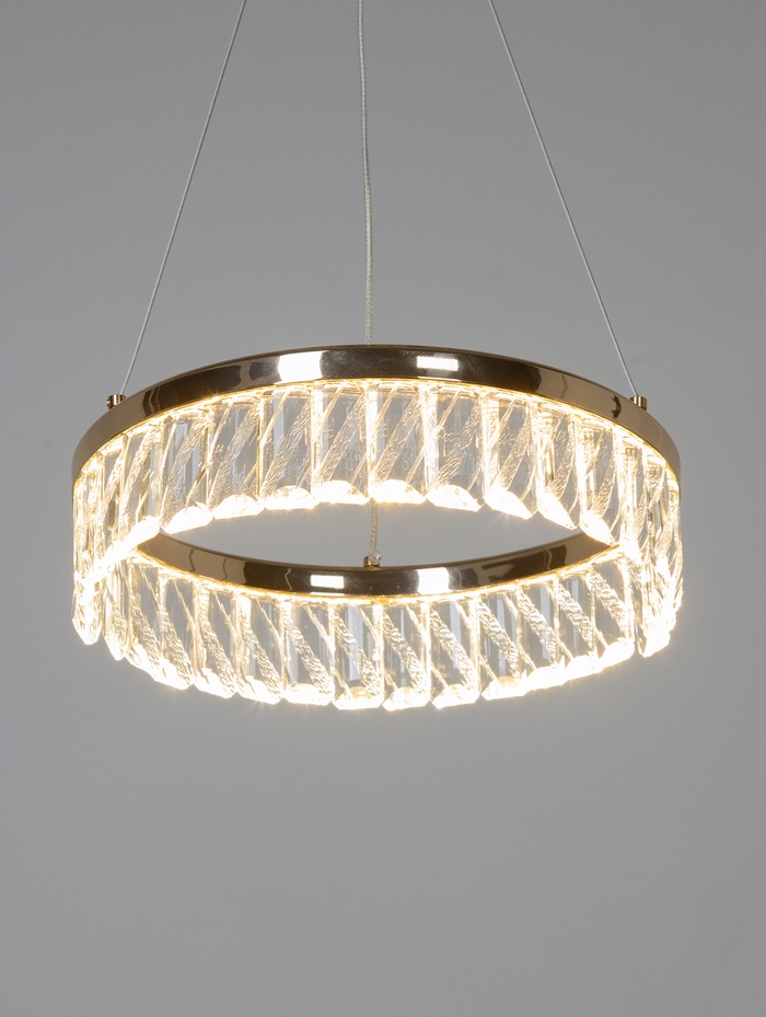 Прозрачные хрустальные элементы формируют эффектную игру света, добавляя глубину и лёгкое мерцание. В сочетании с золотым основанием светильник выглядит элегантно и современно, становясь выразительным акцентом в помещении.
