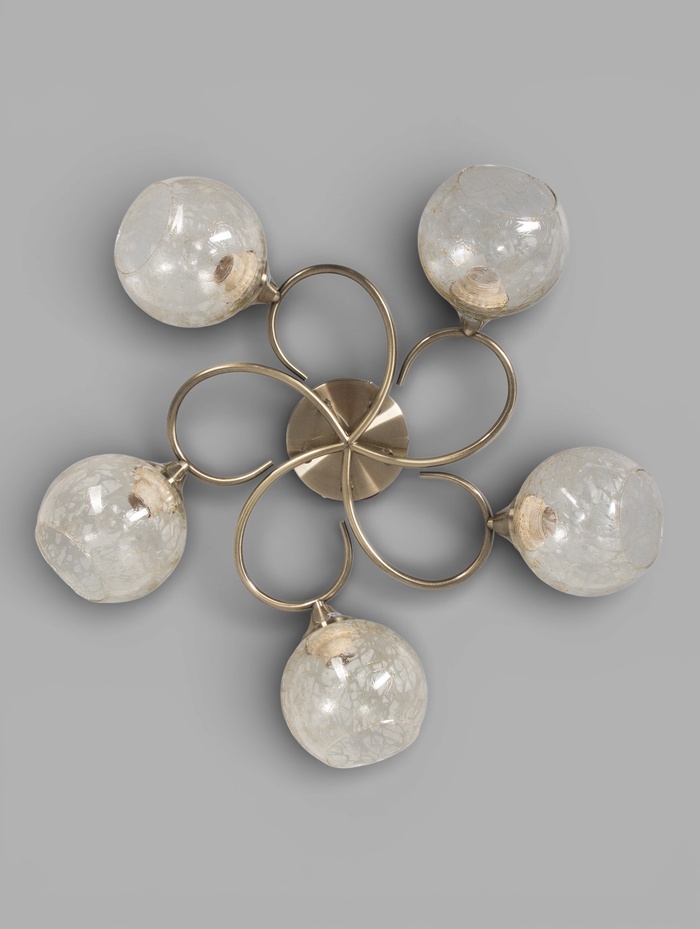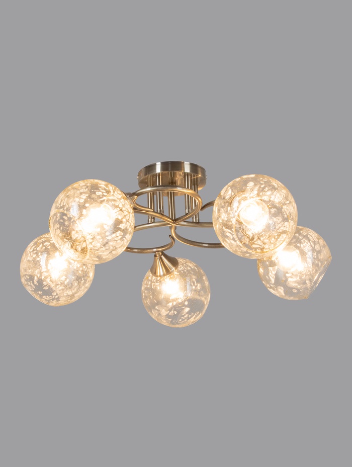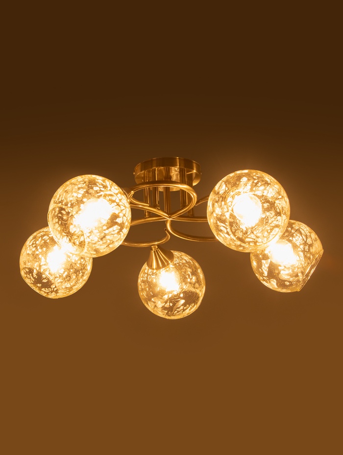 Потолочная люстра с бронзовым металлическим корпусом и пятью шарообразными стеклянными плафонами создаёт стильное и гармоничное освещение в вашем интерьере. Элегантное сочетание блестящей бронзы и прозрачного стекла делает её замечательным центром композиции в гостиной, столовой или просторной кухне, а современный дизайн легко вписывается в разные стилистические решения, от классического до современного. Эта модель привносит теплоту и выразительность, делая помещение визуально более уютным и завершённым.