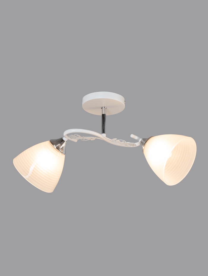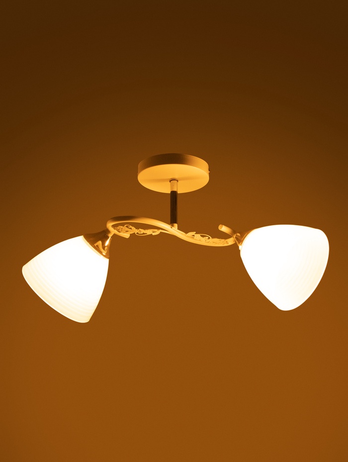 Модель рассчитана на две лампы с универсальным цоколем E27 и мощностью до 60 Вт каждая, что обеспечивает суммарный световой поток около 1600 Лм — достаточно для комфортного освещения комнаты площадью до 11 м². Потолочное крепление на планку обеспечивает надёжный монтаж без подвеса, а управление осуществляется привычным настенным выключателем. При использовании светодиодных ламп люстра подходит для натяжных потолков, что расширяет варианты установки в современных интерьерах.