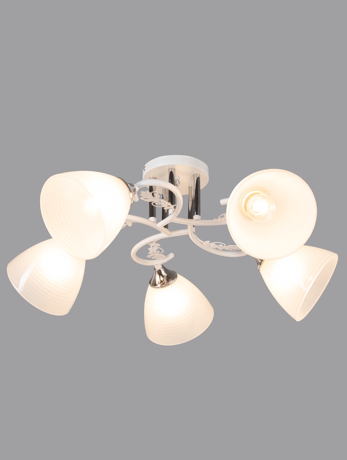 Потолочная люстра с белым металлическим основанием и пятью стеклянными плафонами создаёт мягкое, но достаточно яркое освещение, которое равномерно заполняет пространство и подчёркивает его пропорции. Её лаконичный современный дизайн в нейтральной белой гамме подходит для самых разных интерьерных решений — от минималистичных студий до семейных гостиных и кухонь, где важен как визуальный комфорт, так и функциональный свет.