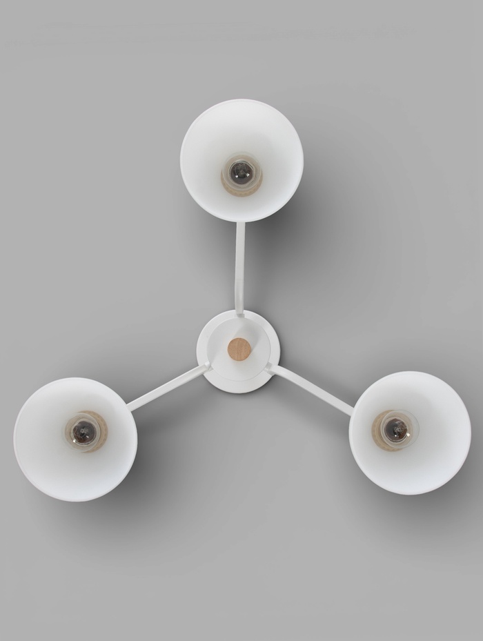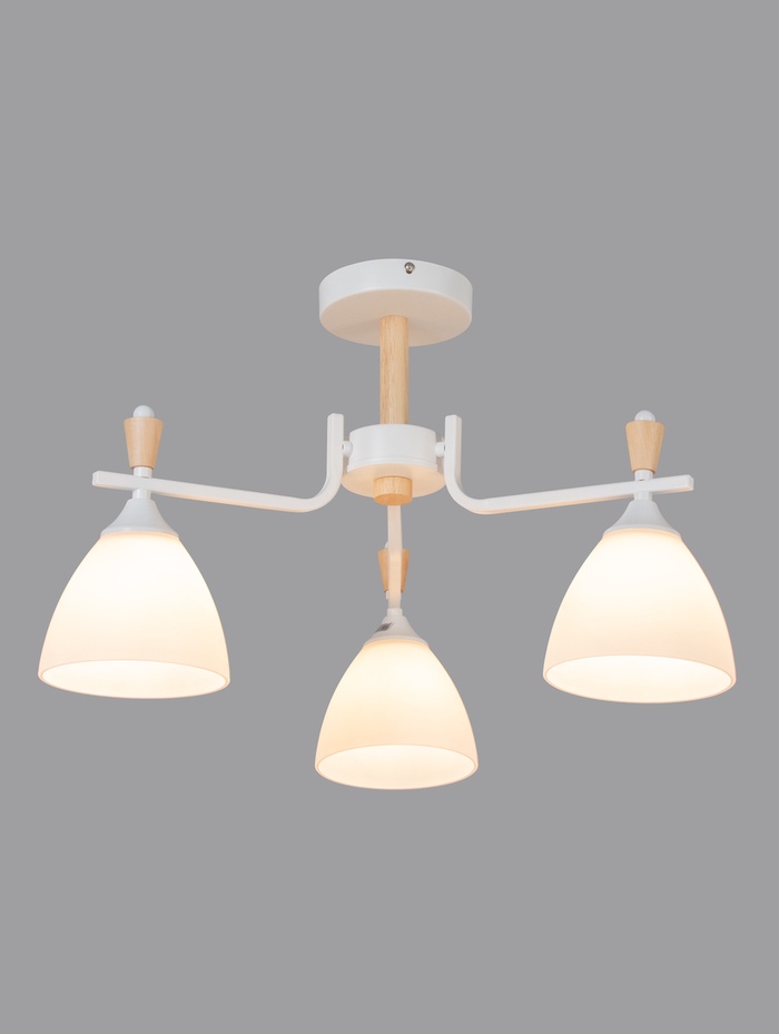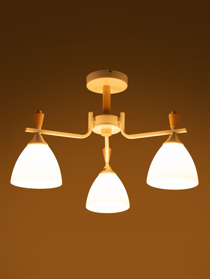 Потолочная люстра с белым металлическим основанием и тремя конусными стеклянными плафонами отлично справляется с задачей создания яркого, но мягкого общего освещения. Благодаря лаконичному дизайну в нейтральной белой гамме она гармонично вписывается в самые разные интерьерные решения — от современной минималистичной гостиной до уютной спальни или кухни. Такая модель делает пространство визуально более лёгким и светлым, не перегружая его лишними деталями.