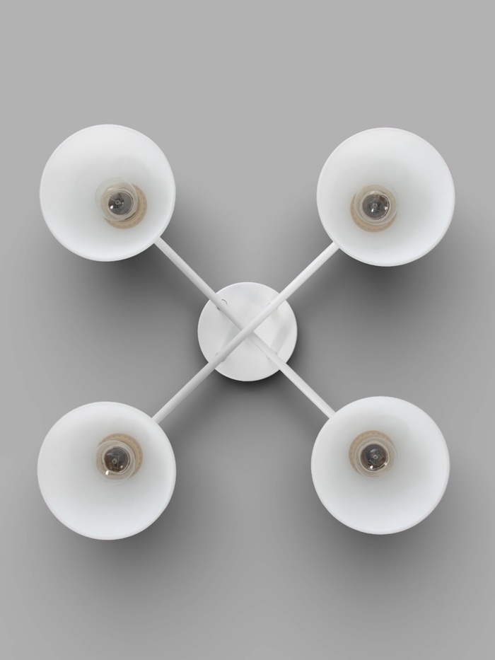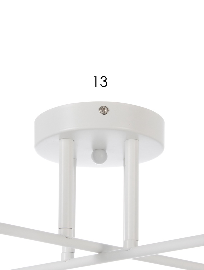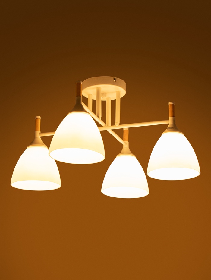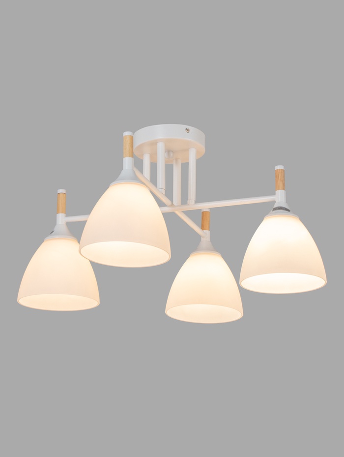 Потолочная люстра с белым металлическим основанием и четырьмя аккуратными стеклянными плафонами создаёт мягкое, равномерное освещение, которое делает комнату более светлой и визуально просторной. Универсальная белая гамма в сочетании с современным дизайном позволяет этому светильнику легко вписаться в интерьер гостиной, кухни или столовой, подчёркивая стиль помещения без лишних деталей и визуального шума.