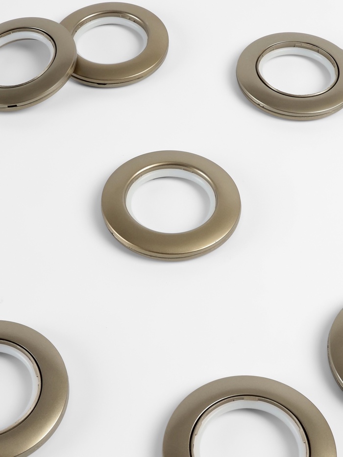 Бронзовые пластиковые люверсы для штор — это стильное и практичное решение для оформления окон. С диаметрами отверстий 4,1 и 7,5 см, они идеально подходят для различных карнизов, добавляя изысканный акцент в любой интерьер.