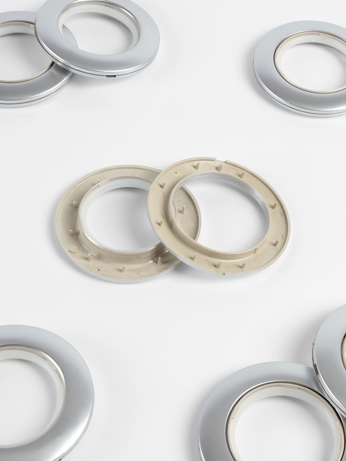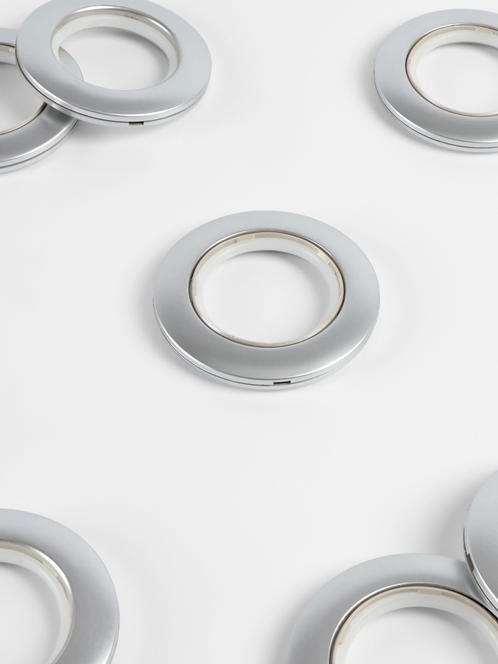 Серебристые пластиковые люверсы для штор — идеальное решение для стильного оформления окон и удобного крепления ткани. С диаметрами 4,1 и 7,5 см, они прекрасно подходят для различных карнизов и добавляют элегантности любому интерьеру.