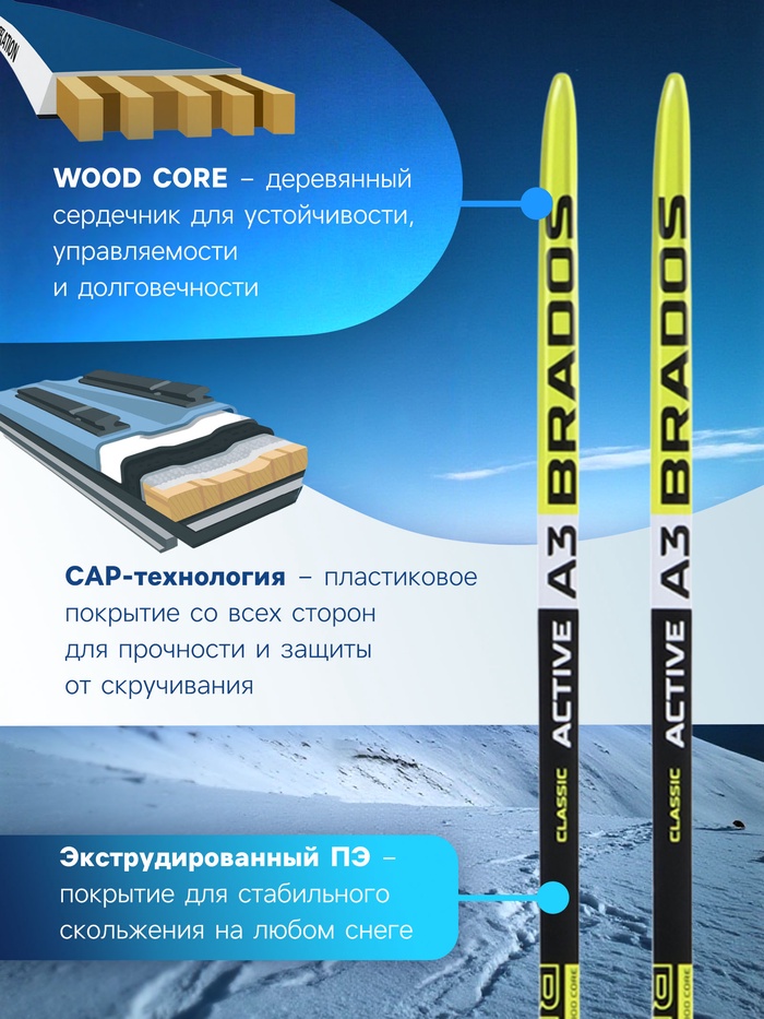 Для всех любителей лыжных прогулок мы рекомендуем их. Они выполнены из высококачественных современных материалов, что позволит вам наслаждаться каждой минутой поездки. Деревянные внутри, они запрессованы в пластиковый кожух, который в свою очередь соединяется со скользящей поверхностью при помощи технологии CAP. Это позволяет сделать усиленный кант и увеличить жесткость на скручивание.