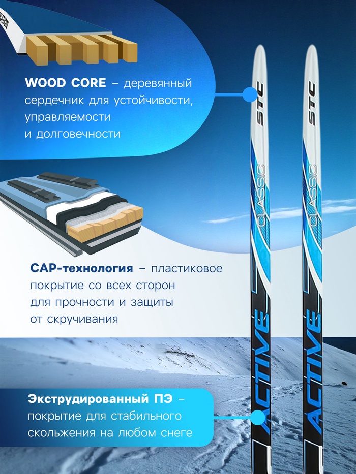 Лыжи выполнены из высококачественных современных материалов, что позволит вам наслаждаться каждой минутой поездки. Деревянные внутри, они запрессованы в пластиковый кожух, который в свою очередь соединяется со скользящей поверхностью при помощи технологии CAP. Это позволяет сделать усиленный кант и увеличить жесткость на скручивание. Лыжи CAP более долговечны и привлекательнее с точки зрения дизайна. Скользящая поверхность покрыта экструдированым полиэстером.